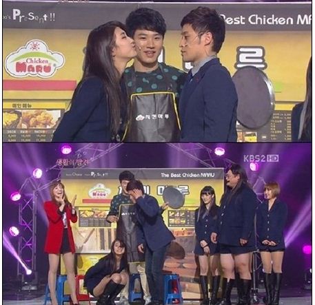이때 수지가 “잠깐”을 외치며 스튜디오에 모습을 드러냈지만 무대가 미끄러운 나머지 수지는 넘어지는 꽈당 굴욕을 당했다. 이런 와중에도 수지는 김준현과의 뽀뽀 해프닝에 적극적인 해명을 하고 나서 눈길을 끌었다.
