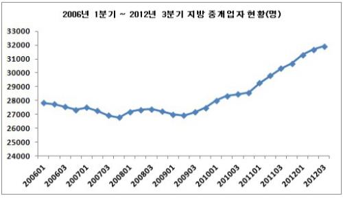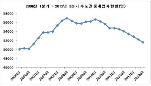 부동산정보업체 부동산써브가 지난 2006년 1분기부터 2012년 3분기까지 전국 중개업자 현황을 분석한 결과, 올 3분기 기준 수도권 중개업자는 5만1,642명을 기록해 지난 2007년 1분기 5만2,616명 이후 최저치로 나타났습니다.