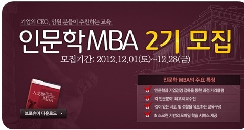 <인문학 MBA>는 이달 28일 까지 2기 수강생을 모집하며, 2013년 1월에 개강될 예정이다. 수강신청은 <인문학MBA> 홈페이지 (http://inmun.passone.net) 에서 할 수 있다.
