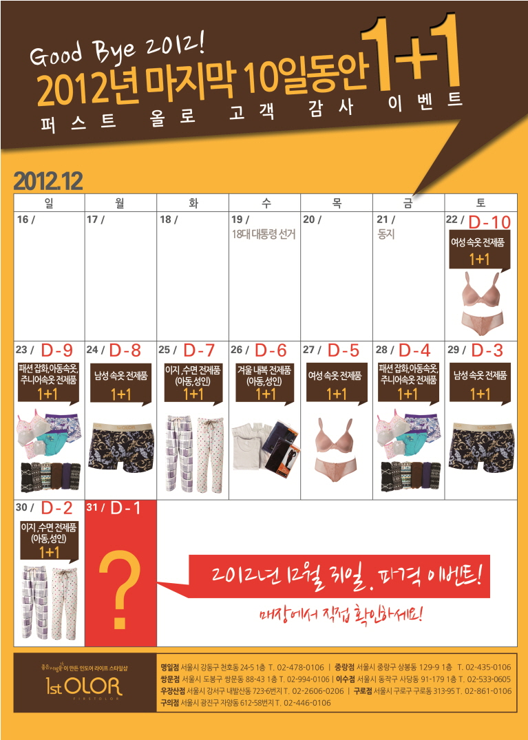 속옷전문기업 좋은사람들의 인도어 라이프스타일(In-door Lifestyle) 브랜드 `퍼스트올로`가 연말을 맞아 오는 22일부터 31일까지 총 10일간 제품 구입 시 동일한 가격의 제품을 선물로 증정하는 ‘굿바이 2012, 1+1 이벤트’를 실시합니다.