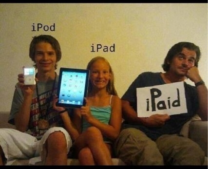 아들이 `iPod`를 들고 있고 그 옆에 딸은 `iPad`를 들고 있다. 마지막으로 옆에 있는 아빠가 `iPaid`라고 적힌 종이를 들고 울상을 짓고 있다.