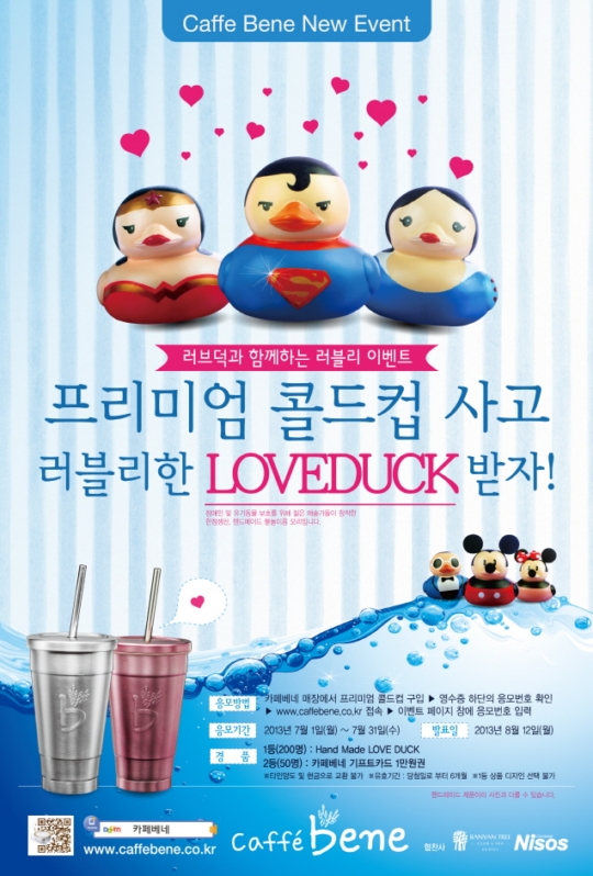 러브덕은 장애인과 유기동물 보호를 위해 젊은 예술가들이 창작한 물놀이용 오리로, 추첨을 통해 1등으로 당첨된 200명에게 증정되며, 2등 50명에게는 카페베네 1만원권 기프트카드가 제공될 예정 입니다.