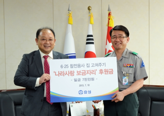 효성은 육군본부에서 노재봉 효성나눔봉사단장, 이재수 육군 인사사령관 등이 참석한 가운데 `나라사랑 보금자리` 기증식을 갖고 후원금 7천만원을 전달했다고 밝혔습니다.
