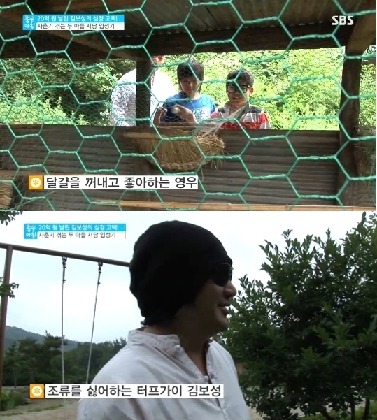 이날 방송에서 김보성은 아들 허정우, 허영우와 함께 두메산골 서당을 찾았다. 두 아들은 서당님의 안내에 따라 양계장으로 향한 후 방금 전 닭이 낳은 달걀을 집어 들며 신기해했다.