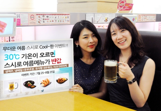 스시로는 이번 핫섬머데이 이벤트를 통해 기상청 발표기준으로 30도가 넘는 날에는 생맥주를 포함해 맥주와 함께 즐길 수 있는 튀김메뉴와 여름 시즌메뉴인 냉메밀 세트를 50% 할인가에 제공한다.