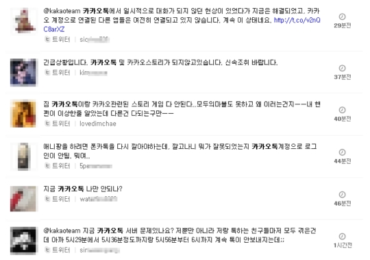 이에 따라 SNS 상에는 카카오톡 시스템 장애를 알리는 글들이 쇄도하고 있다.