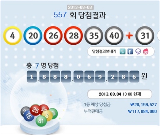 나눔로또는 제557회 로또복권 1등 당첨번호로 `4·20·26·28·35·40`번호가 뽑혔다고 3일 밝혔다. 2등 보너스 번호는 `31`이다.