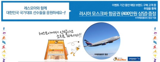 이번 이벤트는 레스모아 온라인 몰에서 이벤트 브랜드 제품을 구매하는 고객들을 대상으로 진행되며, 추첨을 통해 소치 동계올림픽이 치러지는 러시아의 왕복 항공권 2매(유류 할증료, 제세공과금, 공항세는 당첨자가 부담)를 1명에게 증정합니다.