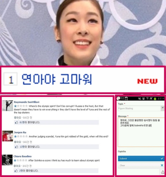 포털사이트 다음 아고라 청원방에는 `김연아 판정스캔들 IOC에 제소해 주세요`, `명백한 사유있는 소치 여자 싱글 금메달 박탈 및 ISU 제소 청원`, `피겨 여자 싱글 선수들에 대한 재채점을 요구한다` 등의 청원글이 올라오고 있다.