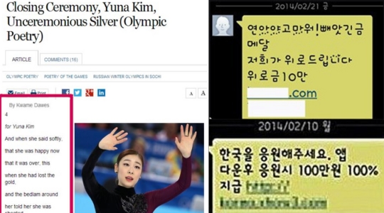 25일 서울시는 공식 블로그 서울톡톡을 통해 김연아 선수 등을 포함해 소치 동계 올림픽에 출전한 선수들에 대한 응원메시지를 위장한 스미싱 유포를 알리며 주의를 당부했다.