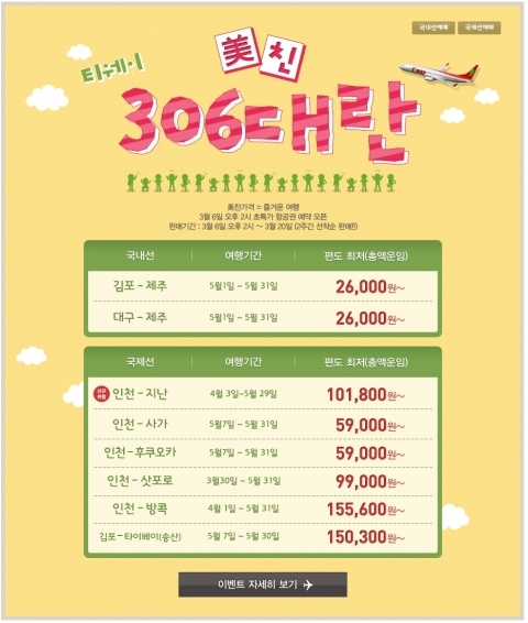 티웨이항공은 이날 오후 2시부터 `美친 306대란` 이벤트를 통해 국내선 김포-제주 노선을 2만6000원, 국제선 인천-후쿠오카 노선을 5만9000원에 판매하는 등 전 노선에서 특가 행사를 진행한다고 밝혔다.