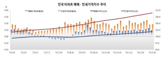 한국감정원이 10일 기준 전국 주간 아파트 가격동향을 조사한 결과, 매매가격은 지난주보다 0.1% 상승했고 전세가격은 0.19% 상승했다.