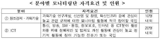 모집 분야는 `창조경제` `과학기술` `ICT` 등 3개 분야이며 모니터링단 선발 인원은 30명 내외로 구성될 예정입니다.