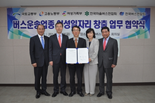 국토교통부와 고용노동부, 여성가족부와 전국마을버스운송사업조합연합회, 전국버스운송사업조합연합회 등은 28일 업무협약을 체결하고 버스운수업종 여성일자리 창출을 위해 공동으로 노력하겠다고 밝혔다.