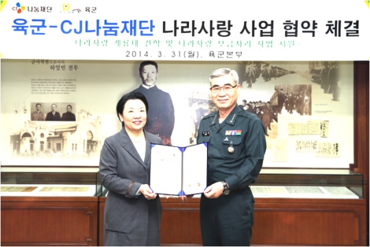 CJ그룹은 지난 3월 31일 육군본부와 함께 군인 가족의 주거환경 개선을 돕고 군 견학 프로그램에 제품과 디자인 재능 기부를 약속하는 업무협약서(MOU)를 체결했다고 밝혔습니다.