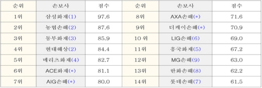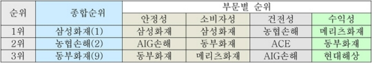평가 결과 1위는 삼성화재, 2위 농협손해, 3위 동부화재이며, 삼성화재는 12년째 부동의 1위를 차지하고 있으며, 올해 손보사로 처음 정식으로 평가 받은 농협화재가 2위를 차지했고, 안정성과 건전성에서 하위로 평가된 롯데손해와 한화손해가 최하위권에 머물렀다.
