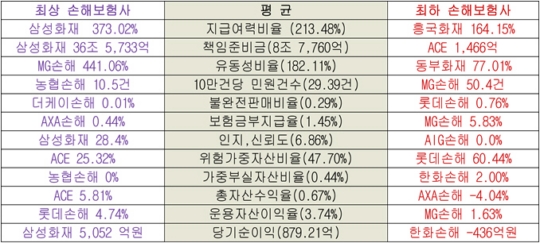 손해보험사 안정성 평가 순위는 삼성화재가 1위를 차지 했으며, 이어 농협손해가 2위, 동부화재가 3위를 차지하였으며, 지급여력비율은 삼성화재가 373.02%로 가장 높았고 이어 AIG손해(281.44%), 동부화재(238.12%)로 높았으며, 흥국화재가164.15%로 가장 낮은 비율을 보였다.