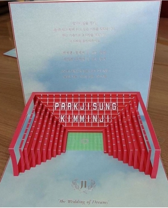 박지성 청첩장에 담긴 축구장은 가운데 푸른 그라운드를 3면으로 둘러싼 빨간 관중석이 돋보인다. 바로 이 축구장 관중석에 박지성과 김민지의 이름이 나란히 적혀 있다.