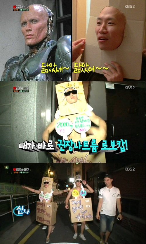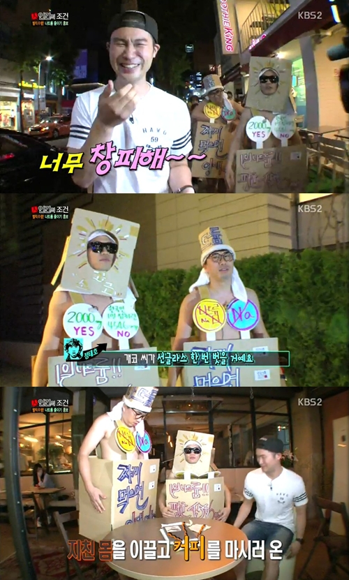 상자 의상을 만든 개코와 정태호는 하의만 입은 상태에서 박스를 걸치고, 선글라스를 낀 채 본격적으로 홍대 거리를 누비기 시작했다.