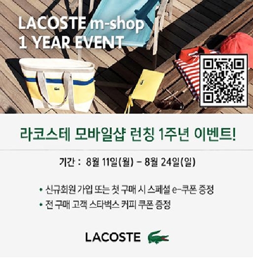 동일드방레가 전개하는 프랑스 프리미엄 캐주얼 브랜드 라코스테(LACOSTE)가 m-shop 런칭 1주년을 맞아 더운 열기를 날려버릴 시원하고 푸짐한 혜택을 증정하는 프로모션을 진행한답니다. 24일까지 라코스테 모바일샵에서 진행되는 이번 이벤트는 라코스테 모바일 샵 런칭 1주년을 맞아 진행하는 감사 이벤트로 이벤트 기간 동안 신규회원 가입 및 모바일 샵 첫 구매 고객들에게 감사의 의미로 모바일 샵 뿐만 아니라 이샵에서도 사용 가능한 스페셜 E-쿠폰을 증정합니다. 뿐만 아니라, 모바일 샵 전 구매고객에게는 덥고 지친 여름, 시원한 여유를 선사하는 스타벅스 커피 쿠폰을 증정한다고 하네요.