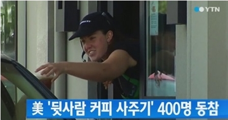 오전 7시 한 여성이 뒤 차량 고객의 커피 값을 내면서 시작된 뒷사람 커피사주기 행렬은 오후 6시 379번째 손님까지 11시간 동안 이어져 놀라움을 자아냈다.