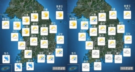 기상청은 이날 중부지방은 고기압 영향을 받아 대체로 맑다 오후에 구름 많아지겠고 대기불안정으로 서울·경기도와 강원도영서는 오후~밤 소나기(강수확률 60%, 5~30㎜)가 오는 곳이 있을 것으로 예상했다.