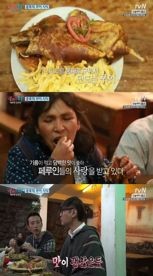꾸이의 정체를 알고 세 남자는 선뜻 그것을 먹지 못하는 모습이었다. 성당 속 벽화에 그려질 정도로 페루 사람들에게 오랫동안 사랑 받아온 전통 음식인 꾸이의 정체는 바로 ‘쥐 구이’ 였다. 쥐과 동물인 기니피그를 통째로 구워 먹는 요리인 꾸이는 페루 원주민들에게 귀중한 단백질 공급원이 되어왔으며 치킨 맛을 연상시키는 담백한 맛이 일품이라고.