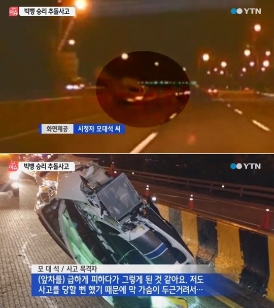 이 사고로 승리와 벤츠 차량에 탑승했던 운전자 등 3명이 병원으로 옮겨져 치료를 받고 있다. 이어 사고 당시 승리가 운전한 차량의 모습이 담긴 블랙박스 영상이 공개됐다.