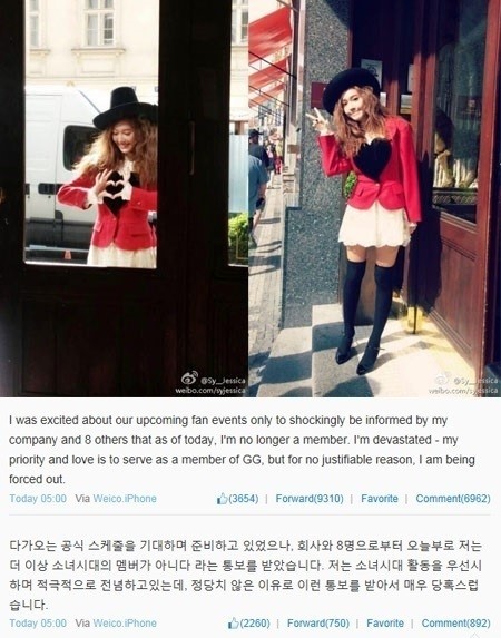30일 제시카 웨이보에 "다가오는 공식 스케줄을 기대하며 준비하고 있었으나 회사와 (나머지 멤버) 8명으로부터 오늘부로 나는 더 이상 소녀시대의 멤버가 아니다 라는 통보를 받았다"라는 글이 올라왔다.