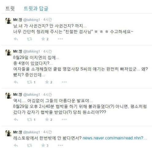 또, "8월 29일 이지연의 집에 총 4명이 있었다지? 여자들을 소개해줬던 클럽 영업사장 S 씨의 이야기는 완전히 빠져있군. 왜 뺐지? 증인인데" 라며 "남, 녀가 사귄 건지? 안 사귄 건지? 까지 너무 간단히 정리해주시는 친절한 검사님. 수고하세요"라고 덧붙였다.