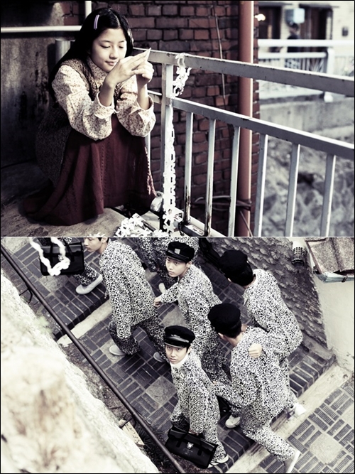 공개된 사진 속 김현수는 낡은 난간 앞에 쪼그리고 앉아있고, 성유빈은 1980년대 교련복을 입고 친구들과 골목길을 지나다가 위를 올려다보고 있는 모습이다.