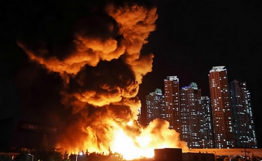 타이어 등이 맹렬히 타면서 붉은 화염이 100여m 높이까지 치솟고 뿜어져 나온 유독 가스와 검은 연기가 인근을 뒤덮었다.