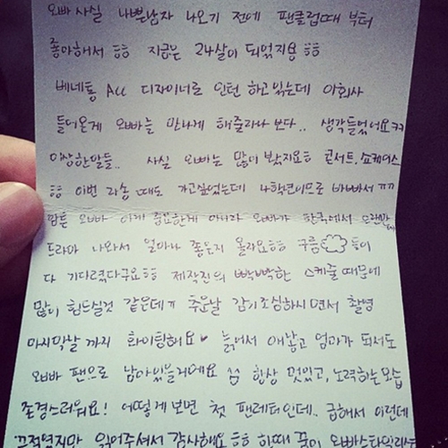 공개된 사진에는 팬이 비에게 건넨 편지가 담겨 있다. 정성스럽게 비에게 마음을 담아 쓴 손편지가 시선을 모은다. 특히 팬은 “어떻게 보면 첫 팬레터인데 이런데 끄적였지만 읽어주셔서 감사하다”고 마음을 전해 비 역시 감동을 받았다고 전했다.