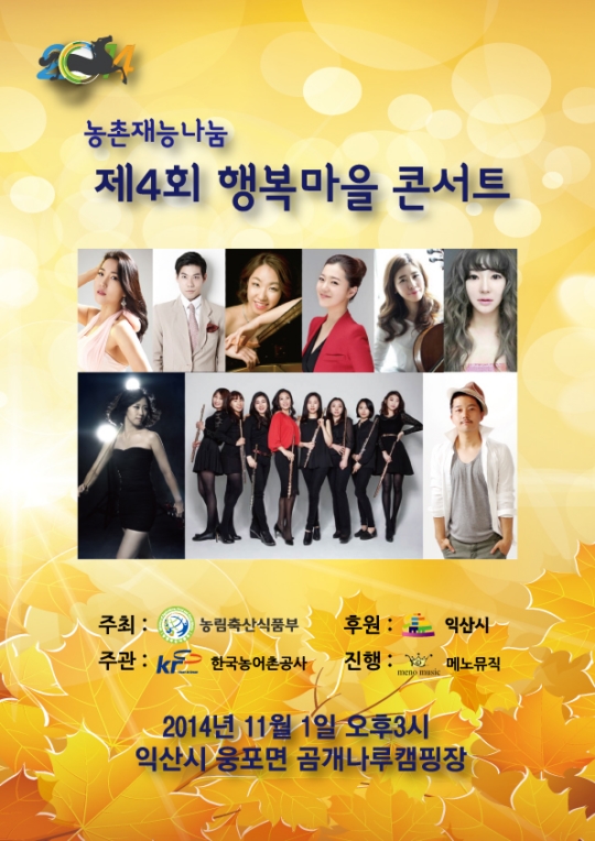 이번에 4회째를 맞이하는 농촌재능나눔 행복마을 콘서트는 2014년 한 해 동안 수 많은 문화·예술인들이 우리농촌을 찾아가 재능을 나누고, 지역 주민들에게 삶의 활력소를 제공하는 역할을 해왔다.