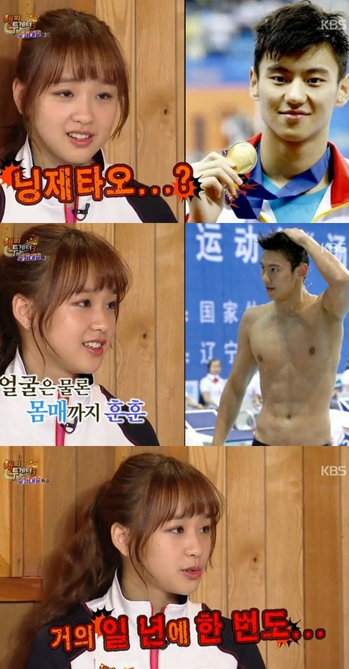 MC 유재석은 손연재에게 "중국 선수가 잘 생겼다고 언급했다는데, 쑨양 선수냐"라고 운을 뗐다. 이에 손연재는 "중국 수영 선수 중에 닝제타오라고 있다"라고 이야기했다.