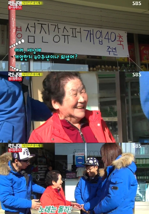 한편 런닝맨 멤버, 유재석에게 간 가수들은 김경호와 김연우였다. 섬진강 슈퍼 개업 40주년 행사를 잘 맡아달라며 주인 할머니는 간곡하게 이들에게 부탁을 했다. 그러면서 "김연우 잘 부탁해"라며 김경호에게 악수를 건넸다. 그러면서도 홍보 좀 잘해주라며 깨알 부탁을 이어갔다. 그러나 할머니는 두 사람이 불렀던 노래는 모른다며 시크하게 웃어댔다. 머쓱한 김경호는 모르는 게 당연하다면서 웃어댔고 `섬진강 슈퍼 개업 40주년` 가게 홍보를 잘 해드리겠다며 큰 소리를 쳤다.