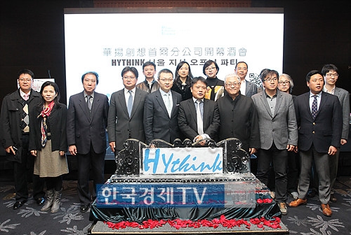 17일 오후 5시 30분 서울 여의도 콘래드 서울 호텔에서 진행된 `HYTHINK 오프닝 파티`에서 바이두 부총재 Zeng Liang을 비롯해 `HYLINK`의 CEO Su Tong, `HYTHINK` 총 책임자 Maisie He, 바이두 판매부 총 감독 Lei Jun 등 중국 인터넷 광고계의 핵심 인사들이 포즈를 취하고 있다.
