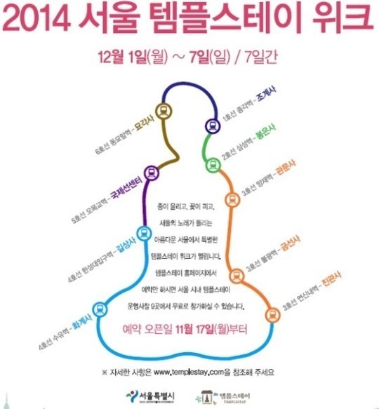 서울시는 12월 1일부터 7일까지 대한불교조계종 한국불교문화사업단과 함께 시내 템플스테이 운영사찰 9곳에서 무료 템플스테이를 제공한다고 밝혔다.