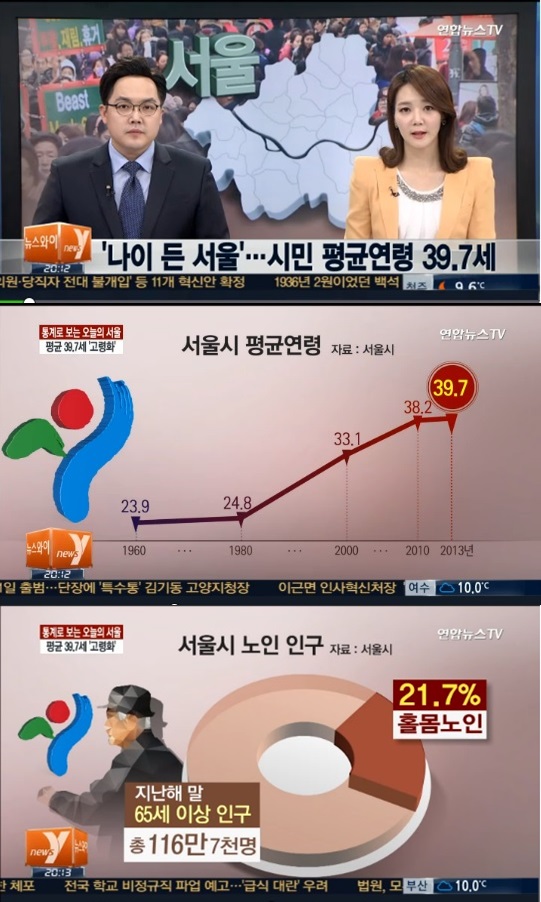 19일, 서울시는 홈페이지를 통해 ‘2014 서울 통계연보’를 공개했다. 통계연보의 내용에는 전체 인구가 3년 연속 감소하고, 노인 인구는 빠르게 증가해 서울시민의 평균연령이 40세에 육박했다.
