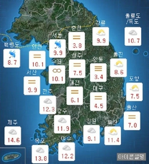 오늘 낮 기온은 서울·대구 11도, 대전 12도, 광주 15도 등으로 전날보다 4~5도 낮을 것으로 전망된다.