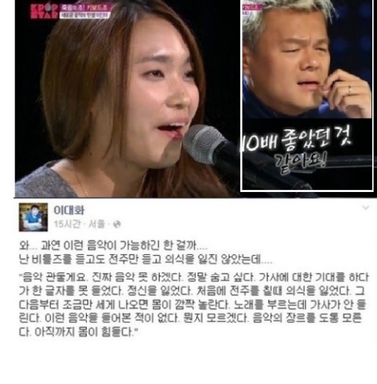 이어 "음악 관둘게요. 진짜 음악 못 하겠다. 정말 숨고 싶다. 정신을 잃었다. 처음에 전주를 칠 때 의식을 잃었다. 이런 음악을 들어본 적이 없다. 뭔지 모르겠다"라고 박진영이 남긴 K팝스타4 이진아의 `마음대로` 심사평을 덧붙여 눈길을 끌고 있다.