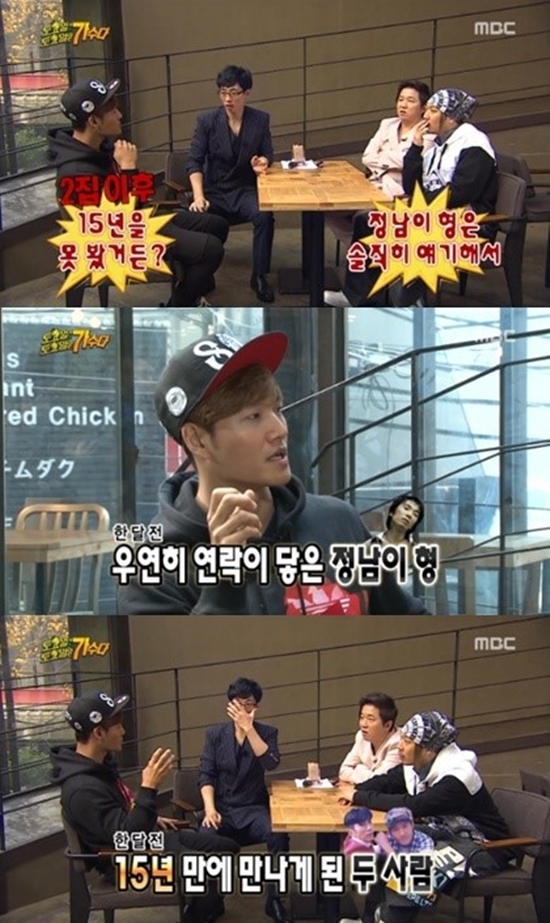 이날 김정남은 노래방에서 김종국과 함께 `어느 째즈바`, `트위스트 킹` 등을 부르며 "다시 이런 일이 없을 줄 알았다. 지난 시간들이 다 기억이 난다"고 말해 감동을 자아냈다.