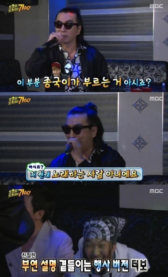 유재석은 "고음 담당 김종국의 부분은 어떻게 하느냐"며 `어느 째즈바` 등 히트곡을 혼자 불러보길 청했다.