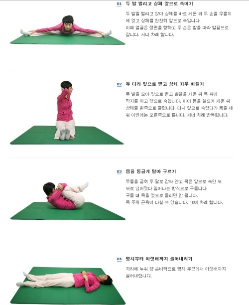다음 동작으로는 두 발을 모아 앞으로 뻗고 발끝을 세운 뒤 목 뒤에 깍지를 끼고 앞으로 숙인다.