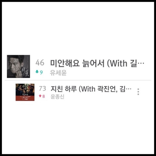 이후 목표 달성에 성공한 유세윤은 자신의 인스타그램에 `성공이다. 이걸로 됐어. 2월에는 토이를 잡아야지`라는 글과 함께 한 장의 사진을 게재했다. 사진을 보면 같은 날 공개한 유세윤의 `미안해요 늙어서 With 길구봉구`가 윤종신의 `지친 하루 With 곽진언 김필`보다 음원 차트 상위권에 있음을 알 수 있다.