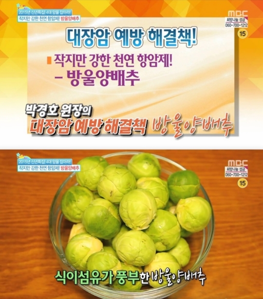 박경호 한의사는 "방울양배추가 대장암을 예방한다"라며 "방울양배추는 석이섬유가 풍부해 대장암이 발생할 확률을 40% 감소시킨다"라고 설명했다. 이어 그는 "방울양배추는 미국 온라인 언론매체에서 선정한 2015년 1월의 슈퍼 푸드로 선정 됐다"라고 덧붙였디.