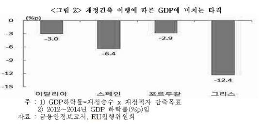그럼에도 불구하고 그렉시트 우려가 높아지는 것은 구제금융 수용조건인 긴축을 이행하지 않을 가능성 때문이다. EU가 분석한 자료에 따르면 취약국일수록 재정긴축 이행에 따른 GDP에 미치는 타격이 심하게 나타났다. 그리스 국민도 그렉시트에 반대하고 있으나 긴축이행에 대해서는 부정적인 입장을 보이고 있다.