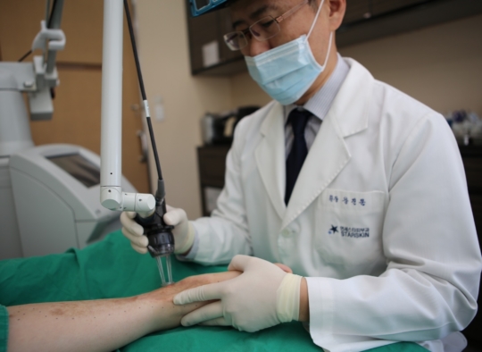 화상흉터 병변 단위 면적당 촘촘하고 깊게 구멍을 뚫어 정교한 치료가 가능하고, 자체 고안한 주사요법 등을 병행해 흉터를 빠르게 회복한다.