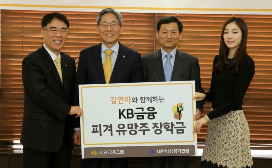 (사진: 왼쪽부터 김기환 KB금융그룹 상무, 윤종규 KB금융그룹 회장, 이기인 대한빙상경기연맹 부회장, 김연아)