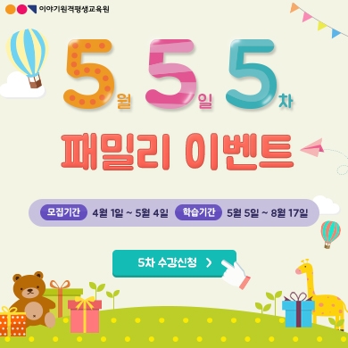 학점은행 교육기관인 이야기원격평생교육원(원장 노용숙)은 오는 5월 5일(화) 2015년도 1학기 5차 개강일을 앞두고 온 가족이 부담 없이 자격증을 취득할 수 있는 ‘패밀리 이벤트’를 진행한다고 10일 밝혔다.